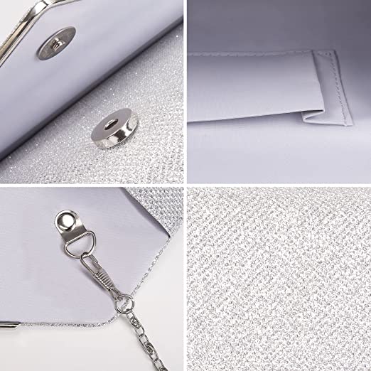 •  [Classic Envelope Clutch]: This clutch is a classic envelope design with glitter and a metal V-cross trim with a magnetic snap flap for a very stylish outfit that will get you noticed at parties.