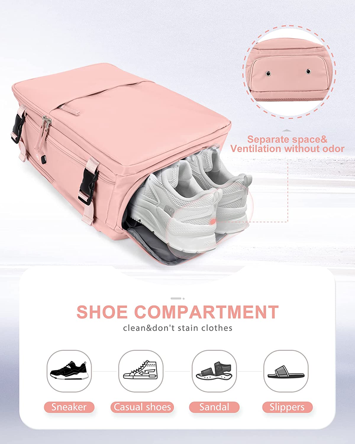 • 【 Shoe Compartment 】: The shoe compartment is located at the bottom of the backpack, and the separate compartment is designed to be clean and sanitary, and will not stain clothes.The space is big enough for a pair of US size 9 shoes. You can put sneakers, loafers, sandals or slippers.The shoe compartment also has two vents to keep the shoe compartment ventilated and odor-free.